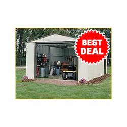 Multipurpose utility storage building has heavy-duty truss system for overall strength. Side utility door for additional access, and with over 8 feet high at the interior center, this building makes a great workshop. Strong sturdy - vinyl-coated steel is 5 times thicker then our standard steel finish. U.S.A Dimensions L x W (ft.): 12 x 24, Style: House, Color: Almond, Outer Material: Steel, Center Height (ft., in.): 8, 6, Frame Material: Steel, Door Type: Roll Up, Storage Volume (cu. ft.): 2,037