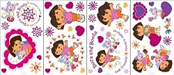 Pattern: Dora the Explorer. Genuine licensed merchandise. Washable, removable and re-usable. Just peel and stick - guaranteed. 34 wall decor stickers/decals of varying sizes, the largest being 9.5" X 8.0" (24.13 X 20.32 cm) and the smallest 1.25" X 1.25" (3.175 X 3.175 cm). This sale is only for the items described. Any other items pictured are for illustration only