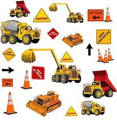 RMK1007SCS Features: -Wall sticker. -Printed on clear material for a ''stenciled'' look. -White or light colored walls are recommended for best results. -No need for a hard hat. -Comes complete with brightly colored dump and cement trucks, cranes and construction signs and will coordinate with most bedding of the same theme. -Can be moved around again and again. -Can change the layout of your construction site as often as you please. -Check out also the coordinated self-adhesive border for the ultimate finishing touch.