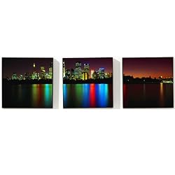 This triptych set captures the skyline at night. Images are digitally printed and then adhered to a dimensional wooden box.