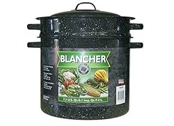 This 7 -1/4 Qt blancher is perfect for preparing all your fruits and vegetables for cold pack canning or freezing.The high efficiency, quick boiling performance combined with the modest cost makes this pot ideal for canning. Constructed of porcelain on low carbon steel. Porcelain enamel is the result of fusing powdered glass to a substrate by firing, usually between 750 and 850 degrees Celsius. The powder melts and flows and hardens to a durable vitreous coating on a carbon steel core. It creates a smooth, hard finish that won\'t burn and resists staining. It\'s also non -porous so it won\'t trap odors or food particles and provides a low coefficient of friction – meaning that it cleans up easily and, it is corrosion and chemically resistant so it will last a long time.When fired, the vessel is placed on pins so the bottom and sides are hardened during the firing process into one smooth laminated glass surface. You may notice slight pin indentations where the glass has flowed around the pin that supports the base during firing. The pin marks do not compromise the finish or performance of the vessel in any way but you should take additional care in handling if using on glass top stove.