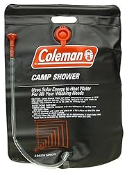The Coleman 5-Gallon PVC Camp Shower uses solar energy to heat the water. It includes a strong handle for easy hanging and carrying. The flexible shower hose with handy on/off valve makes showering a breeze. It may also be used for dishwashing.