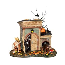 The open door on "Grimsly's Tool Shed" offers peak at the tools inside. A skeleton snoozing in a lawn chair and dog house for "Princess" completes this spooky scene! Designed and manufactured by Department 56.