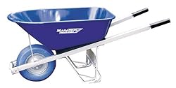 The Marathon Industries 6-cubic-foot steel wheelbarrow moves heavy loads without straining your back. This professional grade wheelbarrow features steel construction, including heavy duty square handles with ergonomic grips for maximum strength, a thick tray, and cross brackets between the legs under the tray. Extremely sturdy, it has stabilizing legs and feet. The entire wheelbarrow comes with a durable blue powder coat finish.