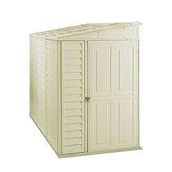 DuraMax Model 00611 4'x8' SideMate Vinyl Shed leans against the side of your house or garage with enough high head room for tall gardening tools, 8 feet of depth for a large 154 cubic feet of storage space in a narrow corridor of your home and has a 30" door opening. Optional foundation kit and window kit are available. DuraMax Stronglasting vinyl sheds offer the most important factor needed when considering the purchase of a shed whether it is for storage or any other use - strength, durability, attractiveness, size, value for the money and low maintenance. They offer all weather vinyl exterior which is light colored and has a "siding like" grain pattern on the walls, a roof truss steel support system, sturdy steel reinforced wall columns, fire retardant vinyl which is exclusive to DuraMax, wide and tall double doors. Their most consumer friendly feature all starts with their state of the art engineering - each shed is modularly designed with purchase decision, shipping, and building it already in mind. Sheds are available in many sizes to fit many needs; they ship compactly in own box; all parts are pre-cut, pre-drilled, and labeled for easy sorting and assembly. US Polymers Inc. is the largest plastic extruder in the world, every product is backed with warranty and full customer support.
