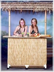 This is the top of the line version of our portable tiki bar offerings. It is perfect for commercial users such as smoothie and frozen drink vendors, caterers and other similar businesses or any time you want to draw attention. It sets up in less than 10 minutes without tools and includes its own set of custom made carry bags with shoulder straps. Many great features are included - Custom manufactured vanilla colored furniture grade PVC pipe with special bamboo fittings, birch bar top and 2 shelves expertly trimmed and finished with high gloss exterior polyurethane, vinyl backed peeled reed skirt to hide products stored on the shelves, intricately woven palapa palm attached to a wood and bamboo hinged frame. Care is taken to provide a true tiki look while maintaining commercial functionality. A power cord is hidden in the structure for convenience, the posts supporting the roof are covered in a faux bamboo PVC material adding to the tiki charm and a rope covered footrest completes the tiki motif. The bar rests on a set of five locking wheels to make it even more portable. The bar top is 60 inches in length and 24 inches deep. The roof measures 72 inches by approximately 60 inches when installed. The assembled bar is 84 inches tall. The bar top height is 43 inches from the floor. Each storage shelf is 48 inches in length and 18 inches deep.